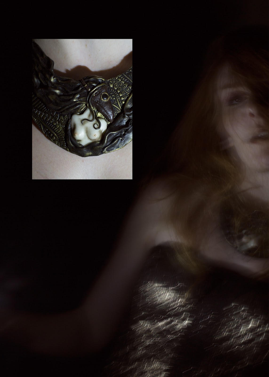 Things like this are obviously right up my alley: I, being a girl who loves studying medieval art and practices, can't help but get excited every time someone references these things in their art. I like that the style is slightly steampunk, so it almost brings the piece into the realm of Victorian gothic. I knew I needed some eerie pictures to go along with it so I shot these in my bathroom. I think I will feature it again as the winter months come, hopefully outside next time so I can get some more evenly-lit detail shots. For now, please enjoy my ghostly take on the Plague Doctor Goddess.